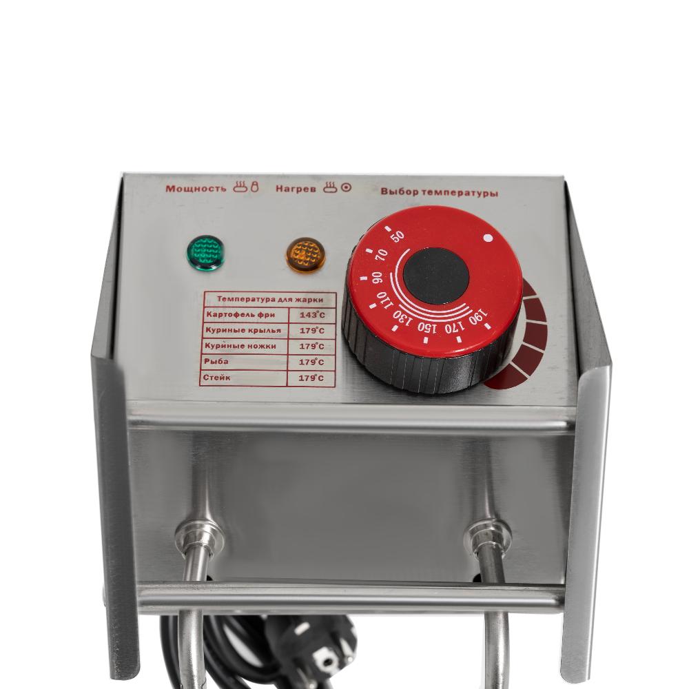 Внутри прибора установлен термостат для выбора температуры (от 50 до 190°C) жарки. Контроль над процессом нагревания осуществляется с помощью соответствующего индикатора. Если температура превышает допустимый предел, срабатывает предохранитель и отключается питание. Таким образом реализуется защита от перегрева.