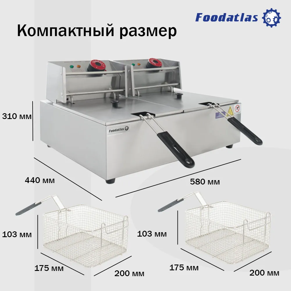 Фритюрница (6л +6л) DF-82 Foodatlas Eco — отличное и качественное оборудование, с помощью которого продукты обжариваются до нежной и румяной корочки. В комплекте идут прочные корзины, модель имеет механическое управление.