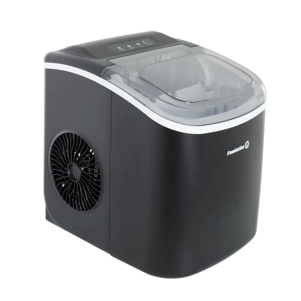 Модель оснащена заливным водоснабжением, воздушной системой охлаждения и внутренним бункером для временного хранения льда объёмом 600 г. Корпус выполнен из пластика, устойчивого к внешним воздействиям, что облегчает транспортировку и уход. Лёд размером 25x30 мм идеально подходит для охлаждения напитков, а также для упаковки и транспортировки пищевых продуктов.